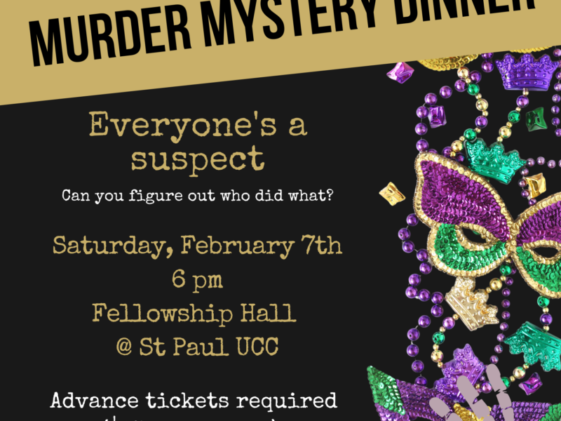 Mark your calendars a thrilling Mardi Gras–themed Murder Mystery Dinner on Saturday, February 7 at 6:00 pm. Child care will be provided. Tickets are $25 and available online or in the Church Lobby (you can register to attend here).