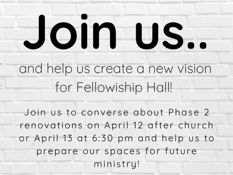 Join us to converse about Phase 2 renovations on April 12 after church or April 13 at 6:30 pm and help us to prepare our spaces for future ministry!